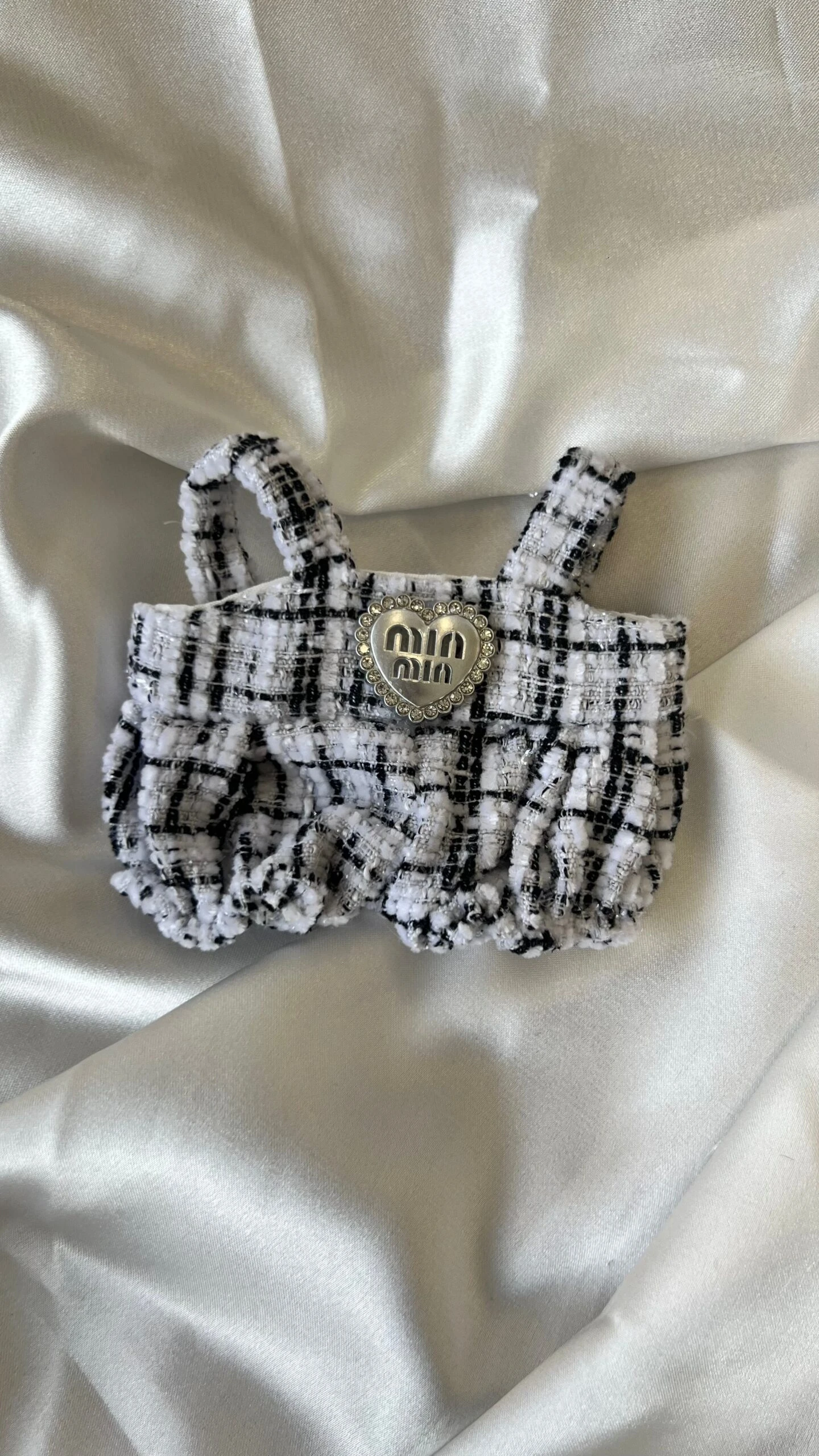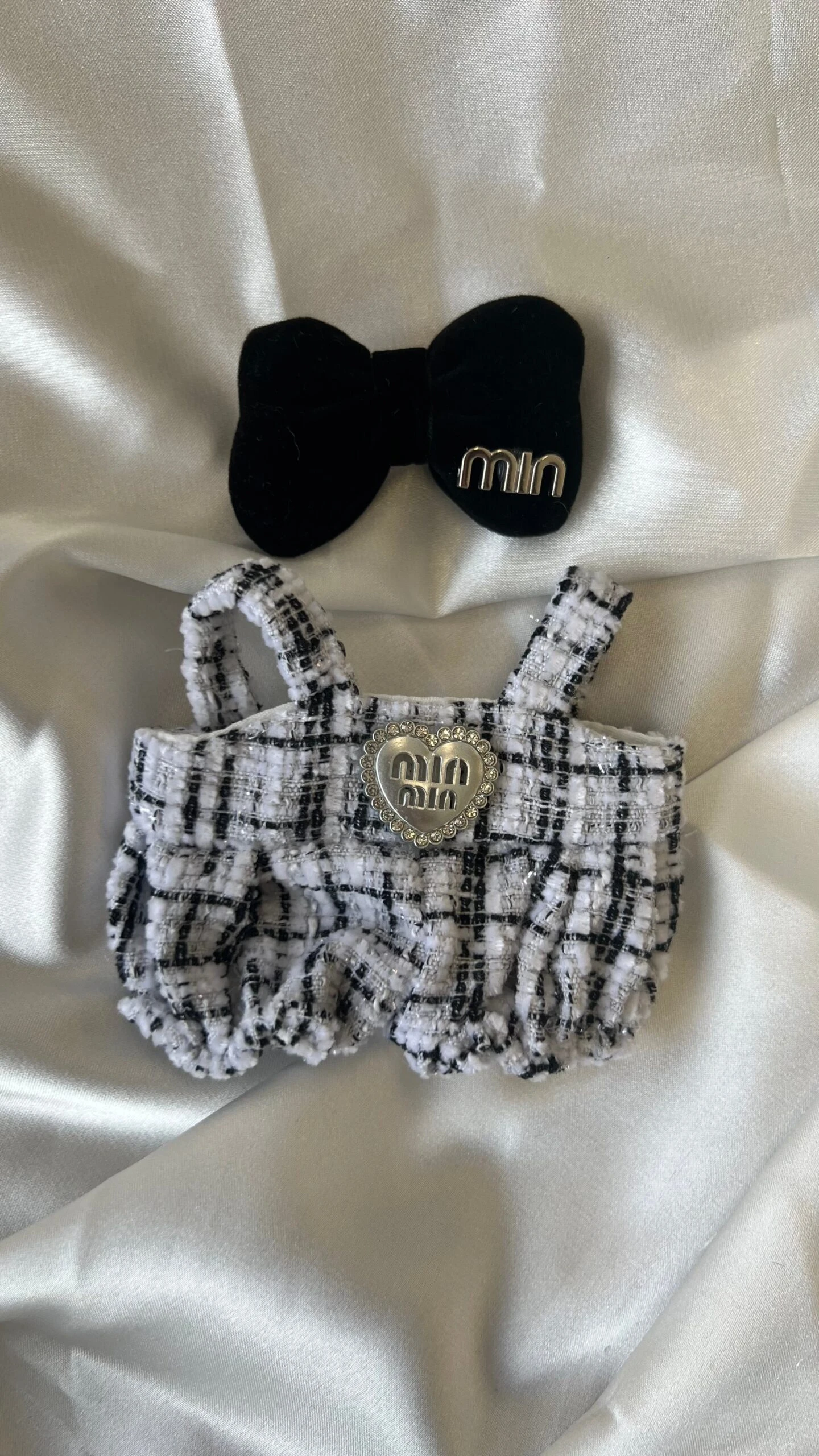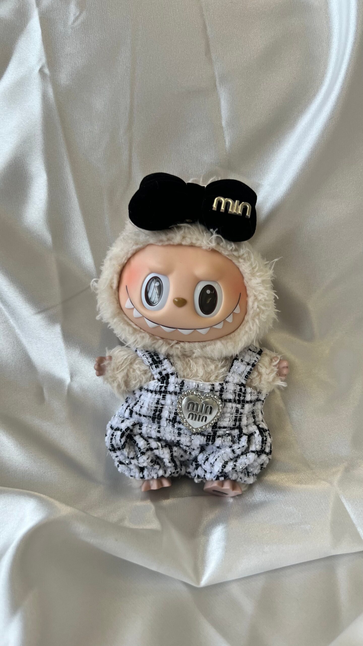 Dress your Labubu in monochrome style with this black and white tweed romper set.