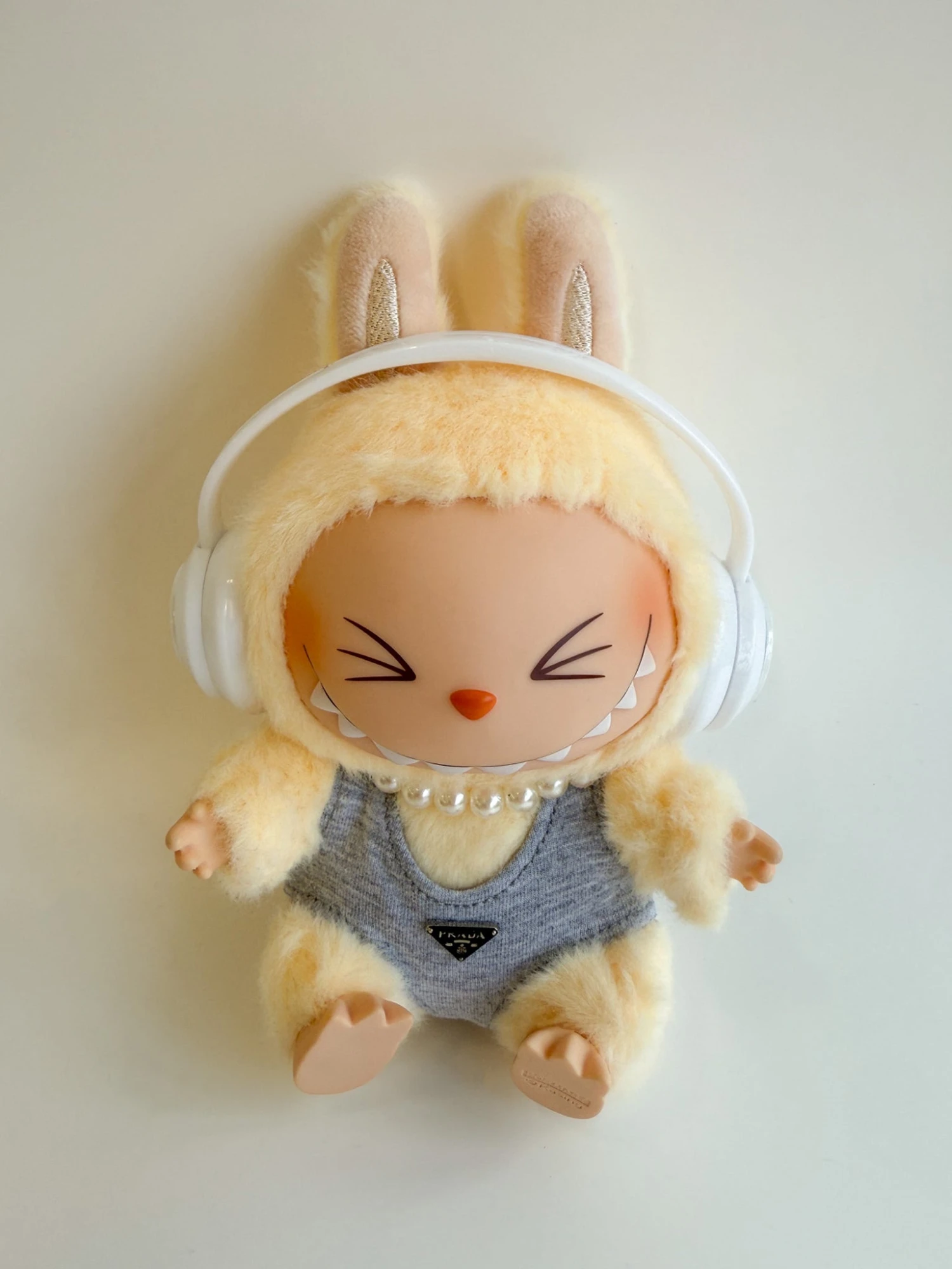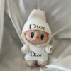 The neutral color palette creates a high-fashion look that complements the Labubu’s cream fur. Each piece reflects the quality and attention to detail associated with these prestigious design houses.
