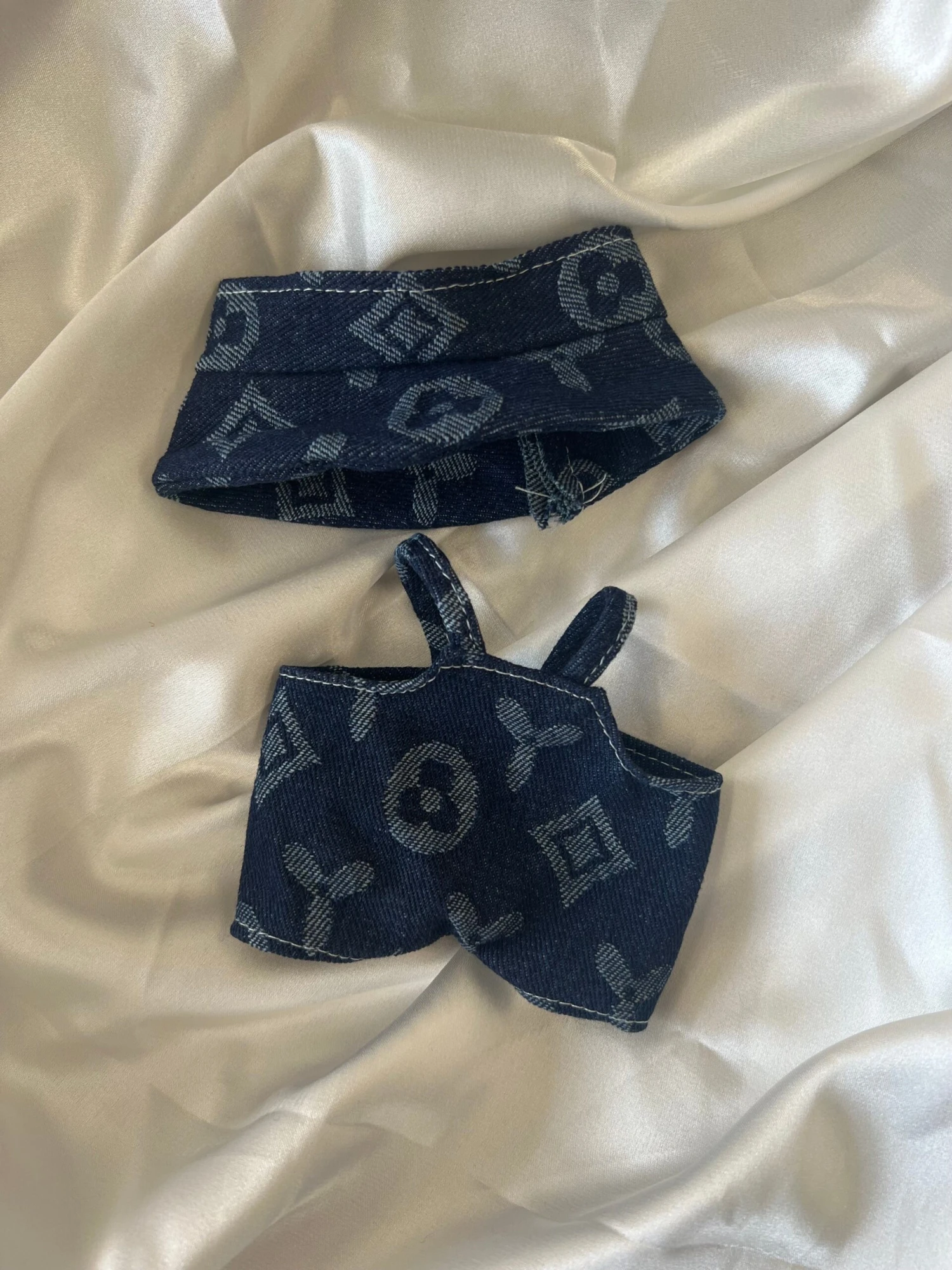 Give your Labubu a luxury makeover with this L.V.-inspired navy monogram denim set — a must-have piece in stylish Labubu clothes and outfits.