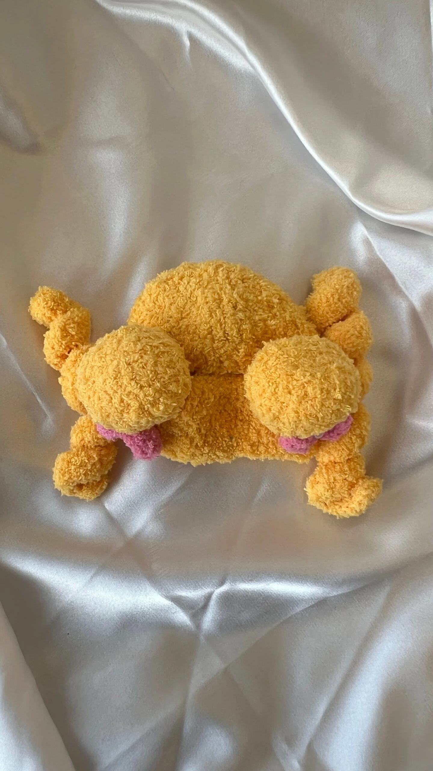 - Bright yellow hood with pink bows and blue-tipped ears