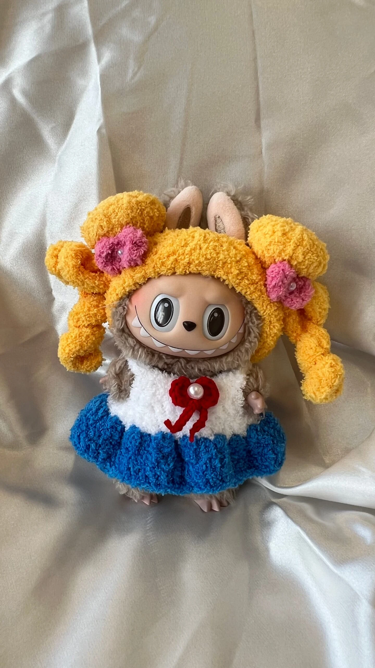 Transform your Labubu plush into a magical sailor with this enchanting Costume Set! Featuring a cheerful blue and white sailor outfit with an adorable red bow accent, paired with a bright yellow hood adorned with cute pink bows and blue-tipped ears, this set is perfect for adding a touch of whimsy to your 17cm Labubu plush.