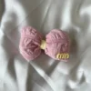 • Oversized plush pink bow hair accessory with center logo accent