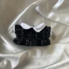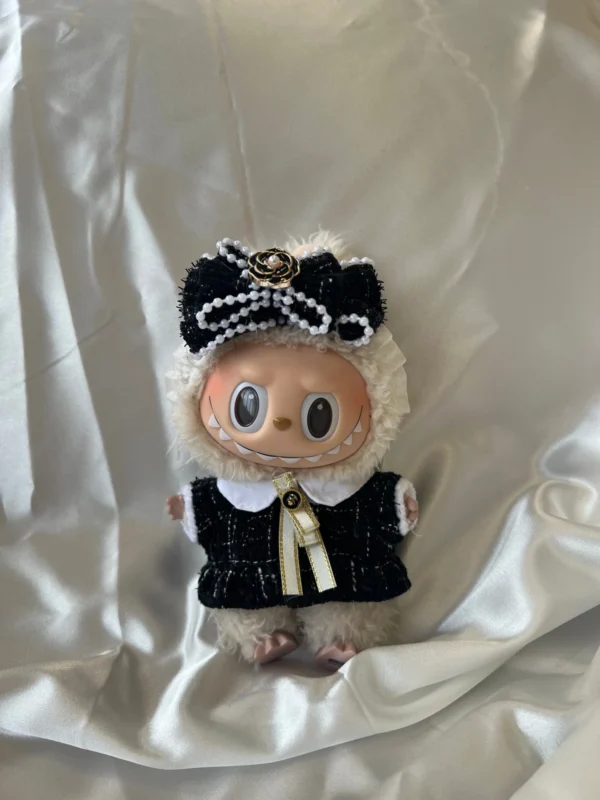 Transform your plush friend into a sophisticated fashionista with our Labubu Tweed Elegance Set! Each exclusive outfit features a luxurious black tweed dress with white fur trim, an elegant pearl-trimmed bow headpiece with camellia flower accent, and a decorative gold chain brooch for that perfect touch of luxury.