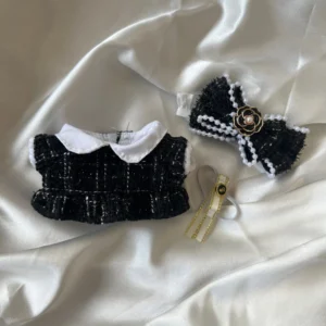 Labubu Tweed Elegance Set – Black Pearl Bow & Gold Brooch Detail (17cm)